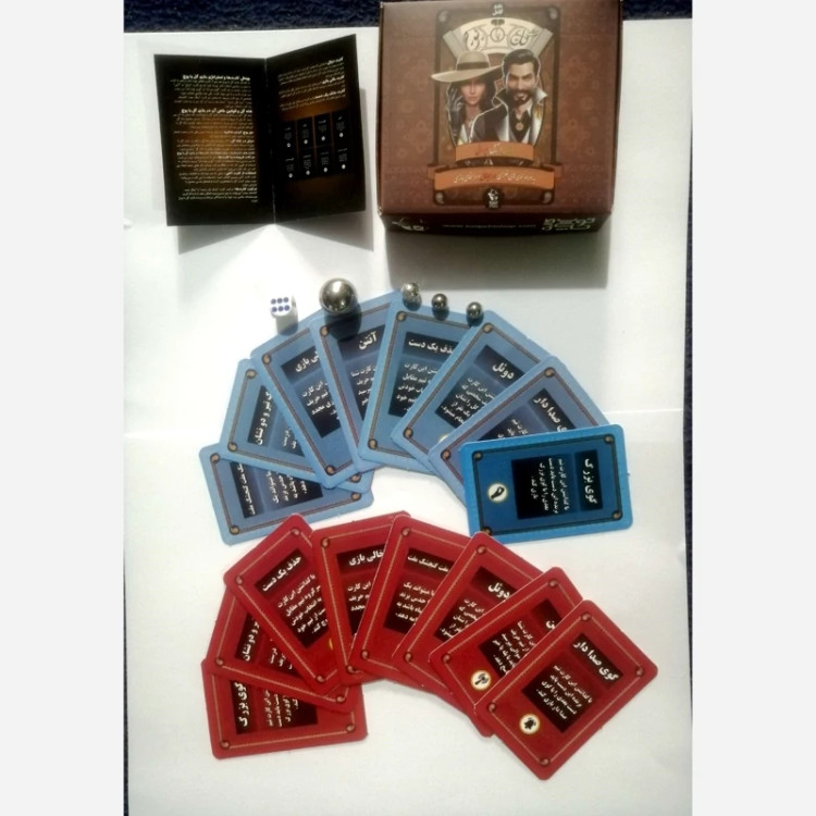 20 عدد کارت 1 عدد تاس 2 عدد گوی کوچک فلزی 1 عدد گوی بزرگ فلزی 1 عدد گوی صدا دار به همراه بروشور آموزش بازی